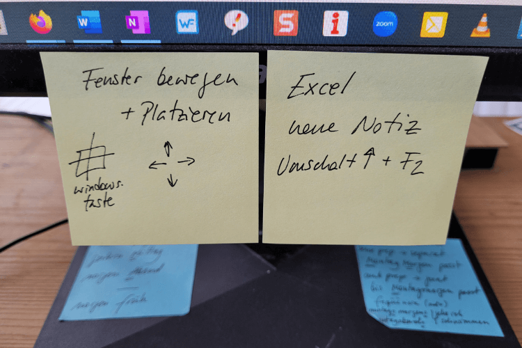 Ganz prominent auf meinem Bildschirm steht ein Post-It mit den Tastenkombinationen, die ich mir gerade aneignen möchte.