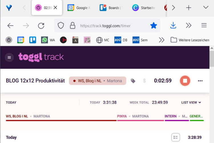 Der Computer ist an. Als Erstes öffne ich den Browser. Drei Tabs sind voreingestellt: Google Calender, Trello und Toggle. Die bleiben bis zum Feierabend offen. So habe ich meine Termine, meine Aufgaben und meine Zeit immer im Blick.